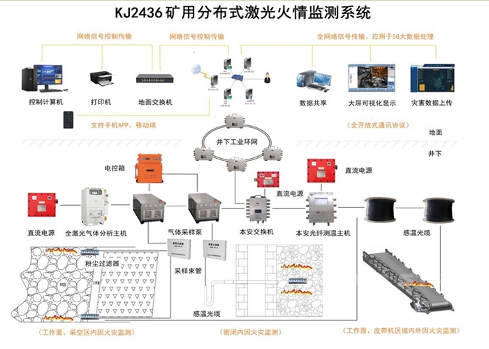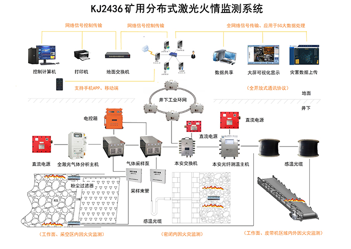 主机采用全激光在线分析技术( TDLAS )实时对目标地址CO、CH 4、CO2、C2 H4、C2 H2、C2 H6、O2、 N2、 NH3、 H2S共10种以上气体组分实时在线分析。主机分析监测数据处理采用一次性多组分在线分析,精度达到PPM级。可通过工业环网将分析结果传输至地面监控中心,为指导安全开采、评估安全风险、精准实施防火措施提供技术依据。